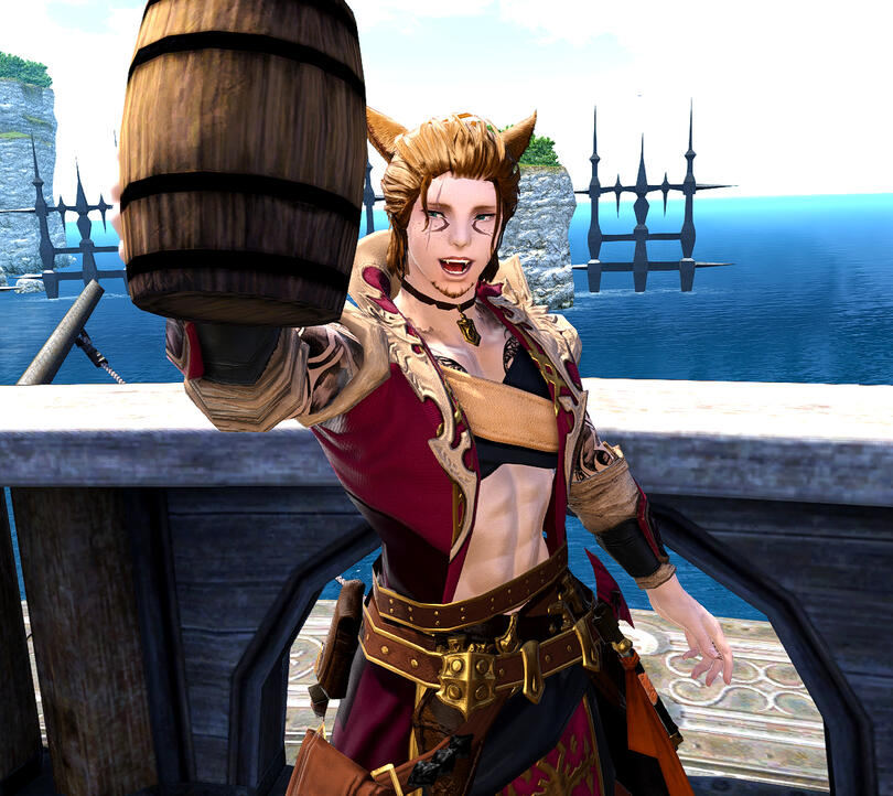 Jak'ir from an early age has always been on a ship of some sort. He was a stow away on a Limsan pirate ship. As to how he got on there or where he came from he doesn't remember. He worked hard for many years on the ship from working as a deckhand learning to fight and live like a pirate. After a bad storm caused a shipwreck with him and few of the crew surviving. He took charge and lead the remaining crew back to cavillation. They named him the next Captain and since then he has lead the crew of the Moonlight Rose on to many adventures and glory. Sailing the seas looking for treasure, hunting down bounties, ferrying people or items across the sea. Every so often after his sailing adventure he stops by the Spellbound Spirits taven and inn located in Limsa Lominsa to either set up shop to sell wares or do trades.